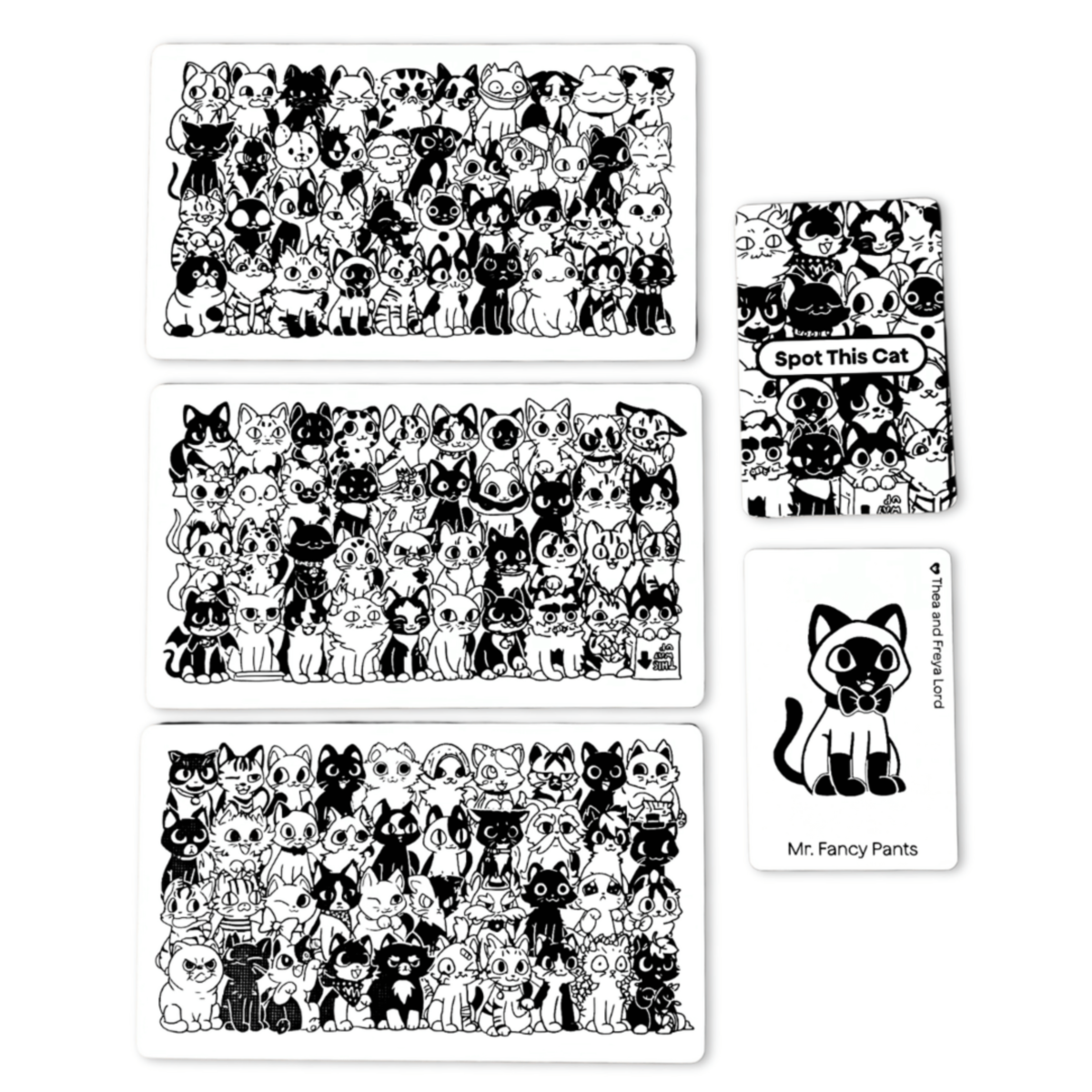 Cat Spotting is a fun and fast series of games where the objective is simple: be the first player to spot the hidden cat in the crowd! These games are best played with 2 players, but can be enjoyed with more.
