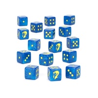 This is a set of 16 six-sided dice with squared edges for use in games of Warhammer 40,000, themed around the Drukhari. They are cast in pearlised blue acrylic plastic with yellow ink markings, and measure 16mm along each edge. The 1-5 facings are traditionally pipped, and each '6' face is decorated with the Kabal of the Poisoned Tongue icon.
