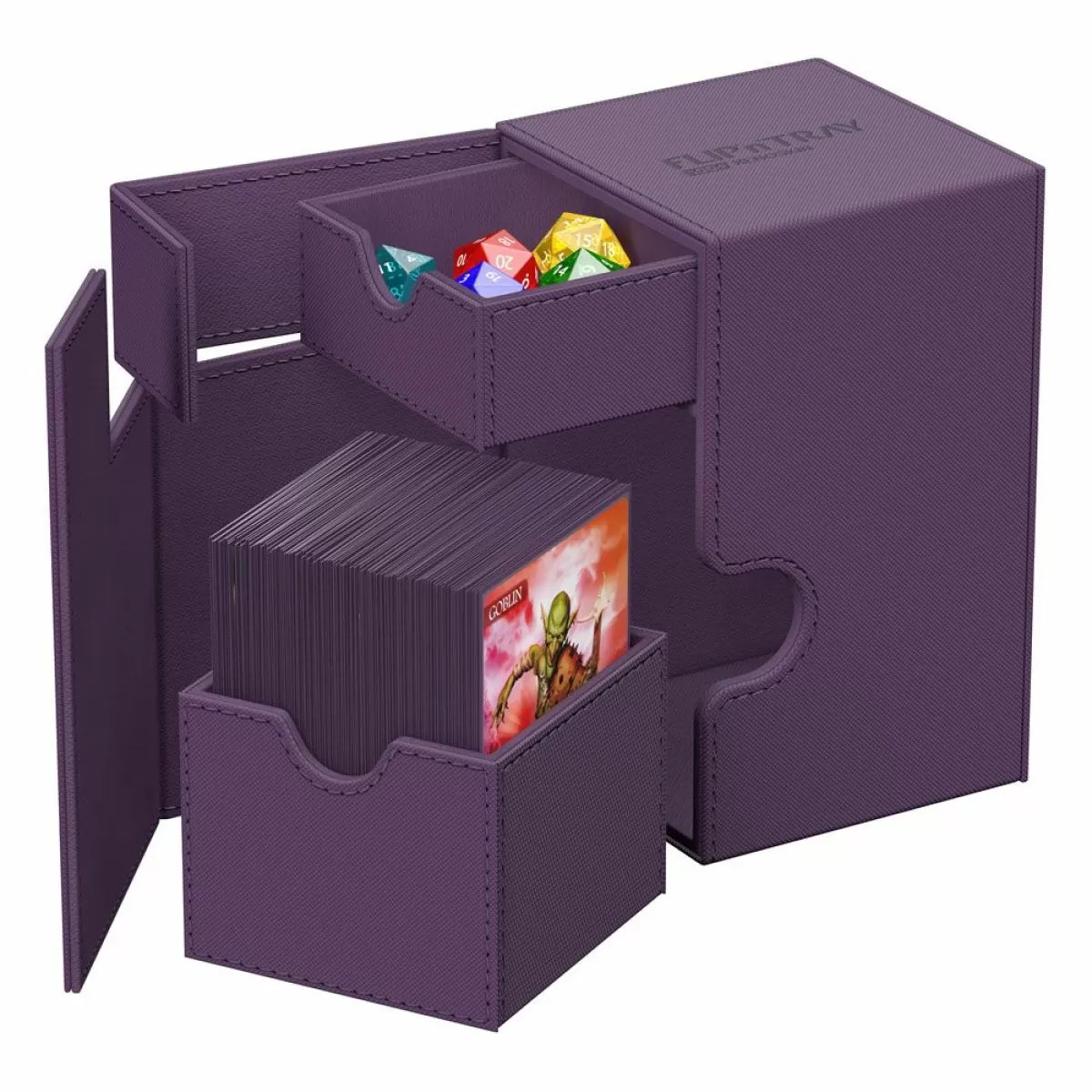 The quintessential Ultimate Guard deck box: a timeless monocolored design with strong magnetic closure, card and dice trays for safe storage of your deck, and a resistant but smooth Xenoskin surface. Looking for additional safety? With room for 100 double-sleeved or 120 single-sleeved cards in standard size, the Flip'n'Tray 100+ has it all.