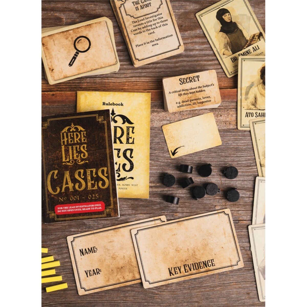 In Here Lies, mystery surrounds every demise. You and your friends, the world's greatest detectives, have gathered to compare your toughest cases. Murders, accidents, betrayals- these are the events of the past you seek to understand. With one player taking the lead, the remaining investigators will inquire about the case, building up a collection of clues that individually do very little, but together create a web of intrigue and storytelling. The lead investigator will listen and guide the team, assessing how close they are getting to their 'eureka moment', with all players winning or losing together.