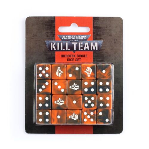 This set includes 20 six-sided dice measuring 16mm along each edge. They are cast in an orange and black swirl finish, featuring white pips and a Hierotek Circle Kill Team icon on each 6 face.