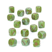 This is a set of 16 six-sided dice with rounded edges for use in games of Warhammer Age of Sigmar, themed around the Maggotkin of Nurgle. They are cast in swirled pale green acrylic plastic with brown ink markings and measure 16mm along each edge. The 1-5 facings are traditionally pipped, and each '6' face is decorated with the bubonic icon of the Maggotkin of Nurgle.