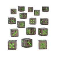 This is a set of 16 six-sided dice with squared edges for use in games of Warhammer 40,000, themed around the Necron destroyer cults. They are cast in black gem-effect acrylic plastic with light green ink markings, and measure 16mm along each edge. The 1-5 facings are traditionally pipped, and each '6' face is decorated with the twisted icon of the Necron destroyer cults